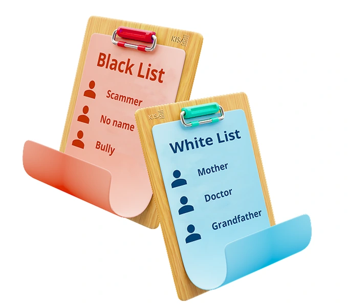 - Whitelist mode: Only approved contacts can call the KISA device. All other numbers are blocked, including private or unknown callers.