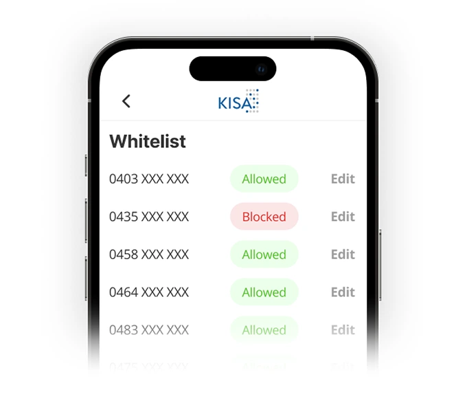 - Whitelisting will limit the calls made to the KISA device, allowing only those programmed into the phone to call it, meaning the KISA user will only hear from people you trust.